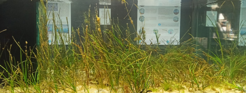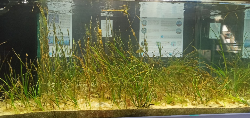 In unserem Aquarium gibt es zwei verschiedene Arten von Schnecken, die Netzreusenschnecke und die Strandschnecke. Beide Arten weiden die Blätter der Seegraspflanzen ab und ermöglichen so dem Sonnenlicht die Blätter wieder zu erreichen. Auch die baltische Meerassel klettert die einzelnen Blätter entlang und frisst fleißig den Bewuchs von ihnen herunter.